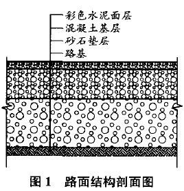 彩色水泥人行道路面施工過程中對地基、墊層處理與普通水泥路面的施工工藝要求相同,要求基層和墊層有足夠的剛度、滿足防凍脹、有能防止產生唧泥所需要的厚度、寬度應大于路面面層寬度等要求(見圖1)。在混凝土基層施工中,要根據不同人行道是否上車的要求,區分不同的用途,設定不同的厚度和強度。彩色水泥面層的施工要在混凝土基層初凝后進行,厚度在l cm~2 cm之間。混凝土基層和彩色水泥面層的施工要用小型機具攤鋪和振實。