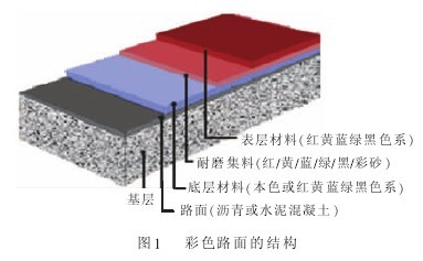 路面的彩色防滑處理技術(shù)主要是指通過采用高性能的雙組分丙烯酸樹脂,將混合選定的高耐磨值的防滑骨料鋪設(shè)于道路表面,使之與基材完好地結(jié)合在一起,在保證極佳的附著力、高耐磨強度的前提下,大大提高了路面的防滑值(SRT60以上),最終減少因道路表面光滑而造成的事故,并縮短剎車距離。彩色防滑路面的結(jié)構(gòu)見圖1。