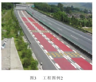 隧道的出入口:里外各延伸50m,滿鋪方法,在隧道入口處,增加兩組間隔線收費站的減速帶:采用三根1m寬,間隔5m為一組,每組間隔11m的三組間隔線,見圖3。