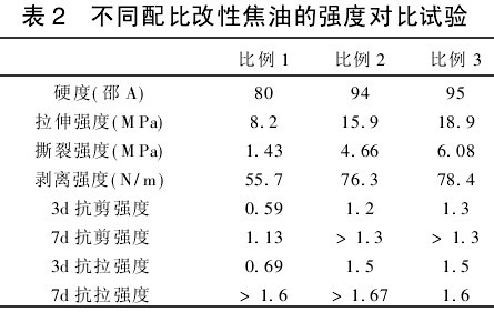(1)改性焦油(比例1)與其它瀝青材料抗拉、抗剪強度對比,結果見表1。