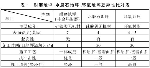 工業彩色耐磨地坪的施工采用機械化施工,并且施工時要和基層混凝土澆筑同步進行,與其他地坪相比,可大幅度縮短工期,避免了水磨石地坪施工時出現的泥漿、污水污染現象,且具有耐磨性好,不起塵;硬度高,可重載;表面致密防滲透;成本低的特點。地坪差異性見表1。