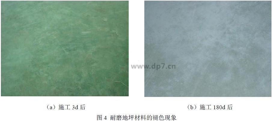水泥基耐磨地坪的一大優(yōu)勢(shì)是可以根據(jù)客戶需求,通過改變顏料種類及摻量,得到不同顏色的耐磨地坪。然而,由于很多有機(jī)類顏料耐堿耐候性較差,從而導(dǎo)致地坪在使用過程中發(fā)生褪色現(xiàn)象,如圖4 所示。
