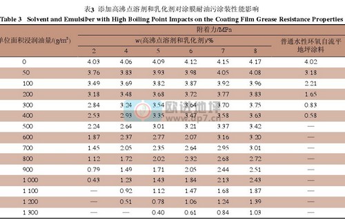 從上述試驗結果可以看出,高沸點溶劑和乳化劑的加入對提高耐油污涂裝性能有非常明顯的效果,它能夠使涂料在含油污較多的底材上涂裝并且仍具有優良的附著力。對施工固化后的涂膜切面進行對比,發現添加了高沸點溶劑和乳化劑的多功能水性環氧自流平地坪涂料的涂膜內部有油污遷移進去,顏色受油污顏色影響變得褐黃,而普通水性環氧地坪涂料油污則全部聚集在涂膜與底材的接觸面上,涂膜內部沒有油污出現。