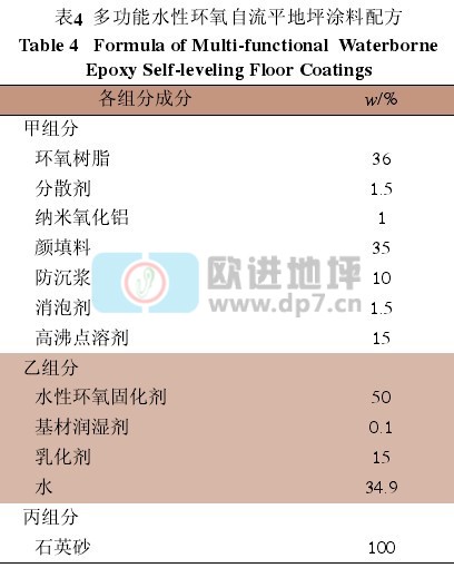 通過大量的試驗研究,研制出了多功能水性環氧自流平地坪涂料,其配方見表4。