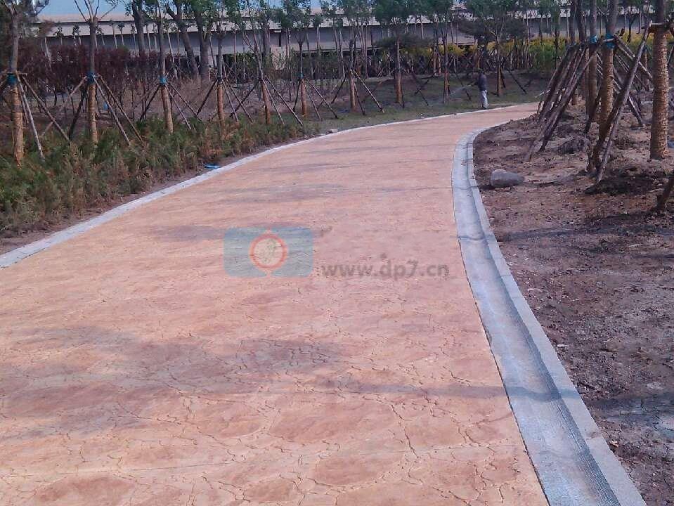 5.等混凝土達到可以壓膜的時候灑脫膜粉,脫膜粉灑均勻,開始壓膜,要求完成后紋路圖案清晰,整體平整,不出現局部凹凸不平和圖案模糊。