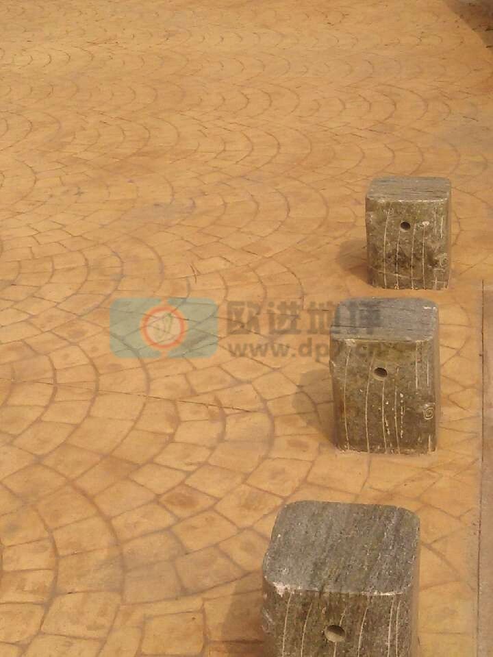 6.壓花地坪常見圖案有:仿木紋、方格磚、扇形、小腳丫、爪子印等。在方格磚、爪子壓膜時要嚴格控制對縫及壓膜深淺問題。遇隱形井蓋時,要先壓周邊模具,待周邊混凝土壓膜徹底凝固后,再放入內圈井蓋,再進行井蓋壓膜,同時壓膜的對縫及線條要同周邊一致且對縫。
