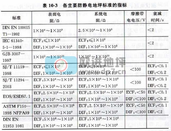 各個(gè)國(guó)家、各個(gè)組織制定防靜電地坪的標(biāo)準(zhǔn)稍有不同,但基本上都是按照地坪的電阻指標(biāo)來(lái)界定的,表為各主要防靜電地坪標(biāo)準(zhǔn)的指標(biāo)。
