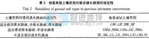 透水地坪路面的工程選址與類型選擇之地質條件,地質條件主要指原地基土的性質,調查地質條件可確定2大問題:其一,原地基是否適合建設透水路面;其二,若可建設,宜建何種類型的透水路面.目前,美國、臺灣等地均按照《Standard Practice for Description and Identification of Soils(Visual——Manual Procedure)》(ASTM 1")2488—2006)進行透水路面地層土壤的描述與鑒別,該法先進行地表土層取樣,制成非原狀土樣后進行目視一手工操作鑒別,最后按統一土壤分類法分類.據國外經驗,可將地基土按適宜建設透水路面程度的不同分為表2所示的3類.由其可見,適宜建設透水路面的多為砂性土地基,粉土、飽和度較高的粘性土則不宜建設,這一結論值得我國參考.當土基不符合要求,但又必須建設時,應先對地基進行加固處理、甚至是換土。