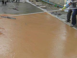 | 藝術地坪施工5. 將標準用量(4.5kg/㎡)的1/2歐進彩色硬化劑均勻播撒在初凝階段的混凝土表面; |