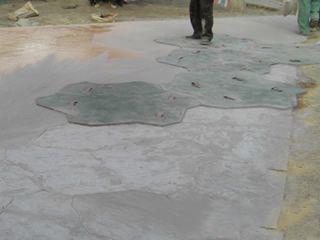 | | 藝術地坪施工6. 待歐進硬化劑蔭濕后用手工鐵板或大抹刀進行第一次找平收光,不要過分鏟抹混凝土表層,這樣會導致表面出水并減弱色彩; |