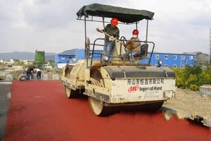 1 根據工程量大小和施工場地情況,選擇的壓路機的型號、功率和臺數。由于輪胎壓路機黑色的橡膠輪胎會對彩色瀝青面層造成嚴重的污染且極易產生粘料現象,故不得采用。