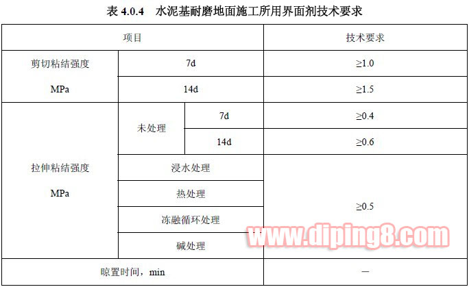 水泥基耐磨地面施工所用界面劑性能應(yīng)符合表 4.0.4 的規(guī)定。