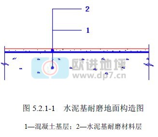 5.2.1現澆混凝土水泥基耐磨地面的構造應由混凝土基層、水泥基耐磨材料層構成(圖5.2.1-1)或由混凝土基層、找平層及水泥基耐磨材料層構成(圖 5.2.1-2)。